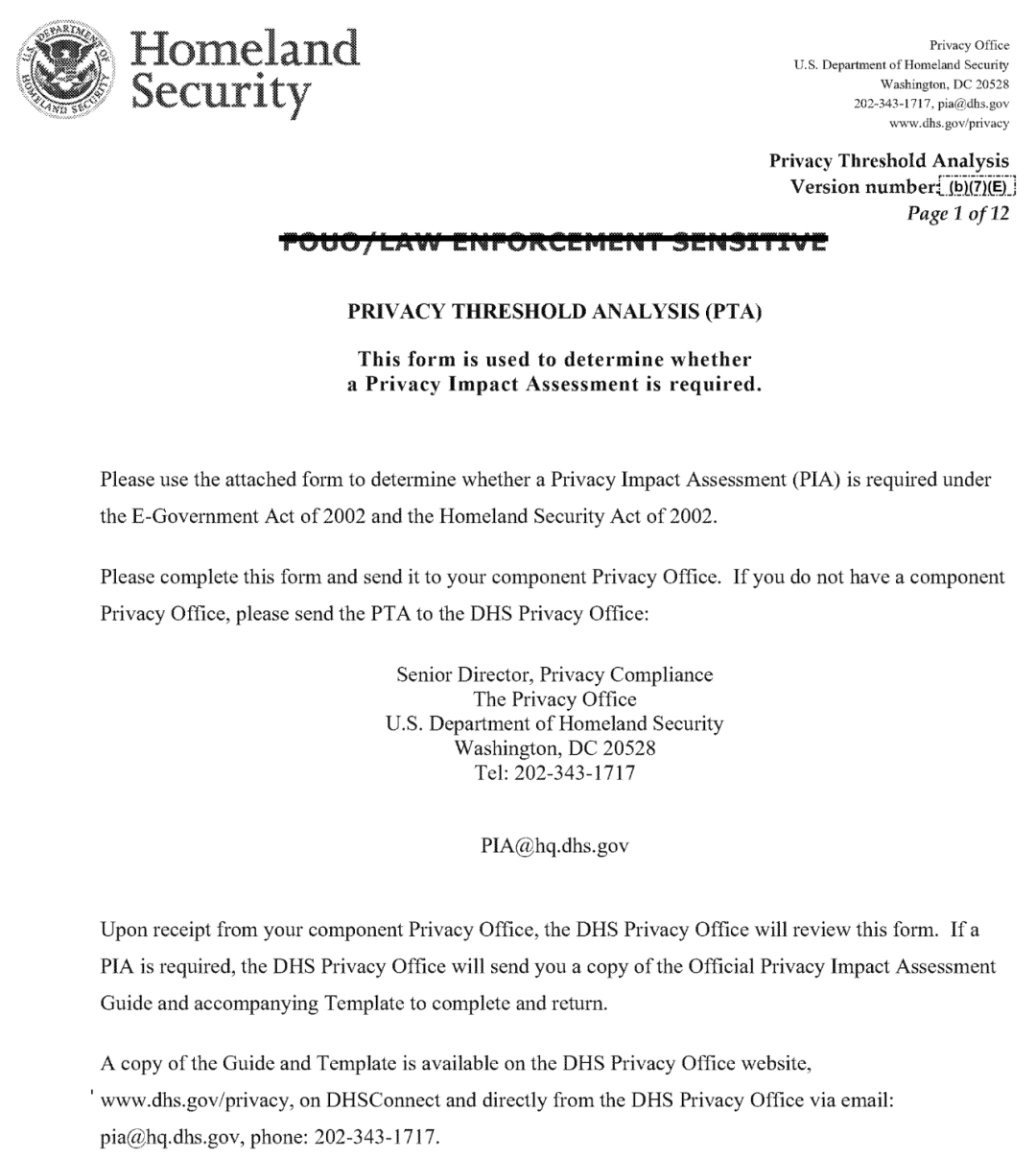 根据《2002 年电子政务法》与《2002 年国土安全法》,DHS 及其下属机构在部署或测试新技术前,必须完成《隐私阈值分析》(PTA),评估该项目是否需要开展全面的《隐私影响评估》(PIA),这是 DHS 内部核心的隐私合规前置程序。