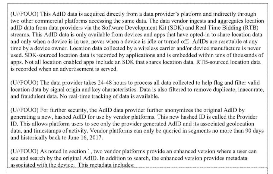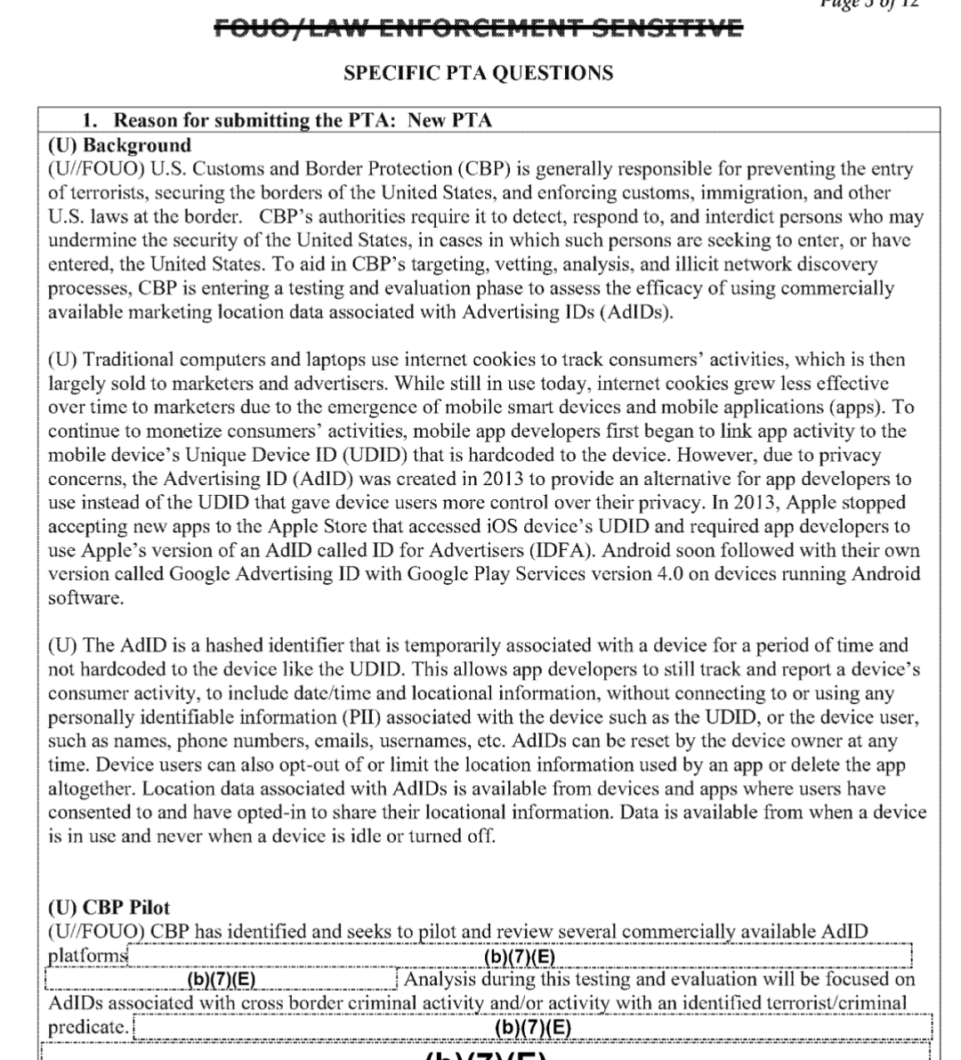 以下为CBP 为 AdID 有效性试点项目提交的 PTA 文件,也是 CBP 首次官方确认其采购的位置数据来源于在线广告行业。