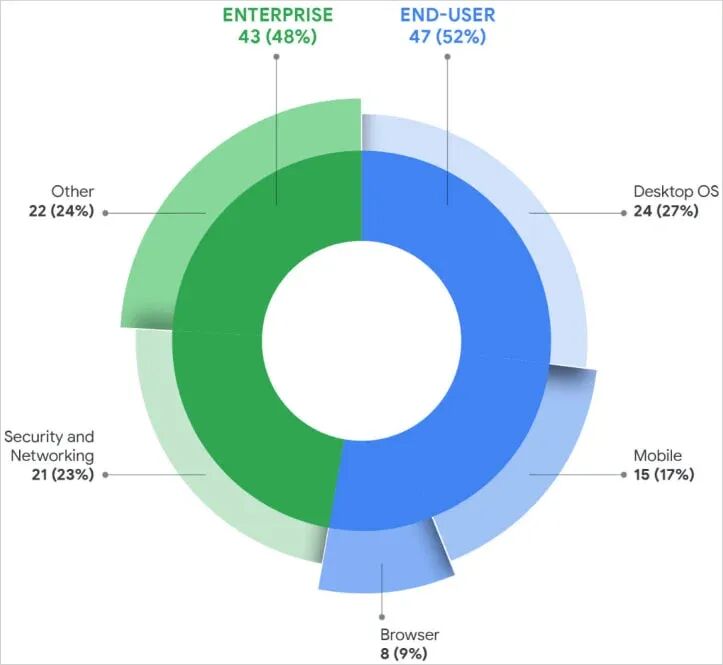 谷歌威胁情报小组今天发布的一份报告指出,在2025年追踪到的90个已被利用的零日漏洞中,有47个针对终端用户平台,43个针对企业产品。