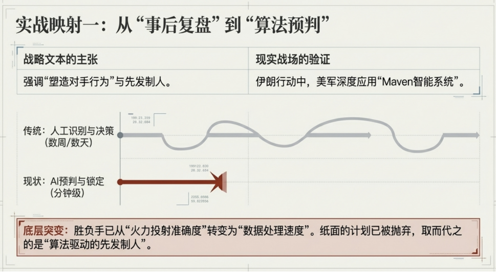 一是从“事后复盘”到“算法预判”。在《战略》中“塑造对手行为”被提升到前所未有的高度。映射到现实,美军在伊朗行动中应用的“Maven智能系统”也验证了战争的胜负手已不再是单纯的火力投射,而是“数据处理速度”。当AI将目标识别周期从数周压缩至分钟级,这种前置的“一以贯之”实际上宣告了,未来战略可能不只是纸上的计划,而是算法驱动的先发制人。