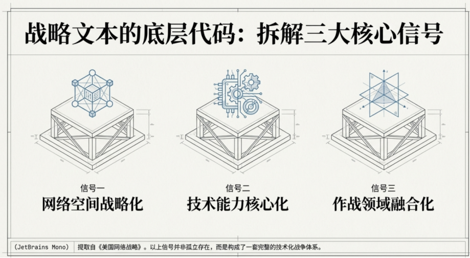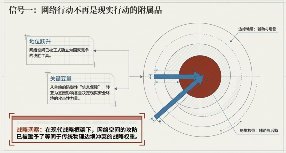 从上述视角出发再来看《美国网络战略》可以发现其中至少透露出几个值得注意的信号。其中,网络空间的战略化、技术能力在作战中的核心地位,以及不同作战领域之间的加速融合,尤为值得关注。信号一:网络空间的战略化。网络空间在国家安全中的地位正在被进一步提升。此战略文件不仅强调网络防御的重要性,也将网络能力视为国家竞争的重要工具。这意味着网络行动不再只是辅助性手段,而是逐渐成为影响现实安全环境的重要因素。信号二:技术能力成为作战核心。技术能力正在成为决定作战效果的重要来源。随着数据处理能力、自动化系统以及人工智能技术的发展,信息获取、情报分析和决策支持的效率都在显著提高。此战略文件中对于技术能力的强调,反映出一种越来越清晰的趋势:作战优势正在更多地来自信息与技术体系,而不仅仅是传统的兵力规模与机动能力。信号三:作战领域的加速融合。网络行动、情报活动以及现实空间中的军事行动之间的联系日益紧密,不同领域的能力开始在同一行动框架中协同运作。这种跨域整合意味着,未来的行动往往不再是单一领域的作战,而是多种能力在同一时间窗口内的综合运用。