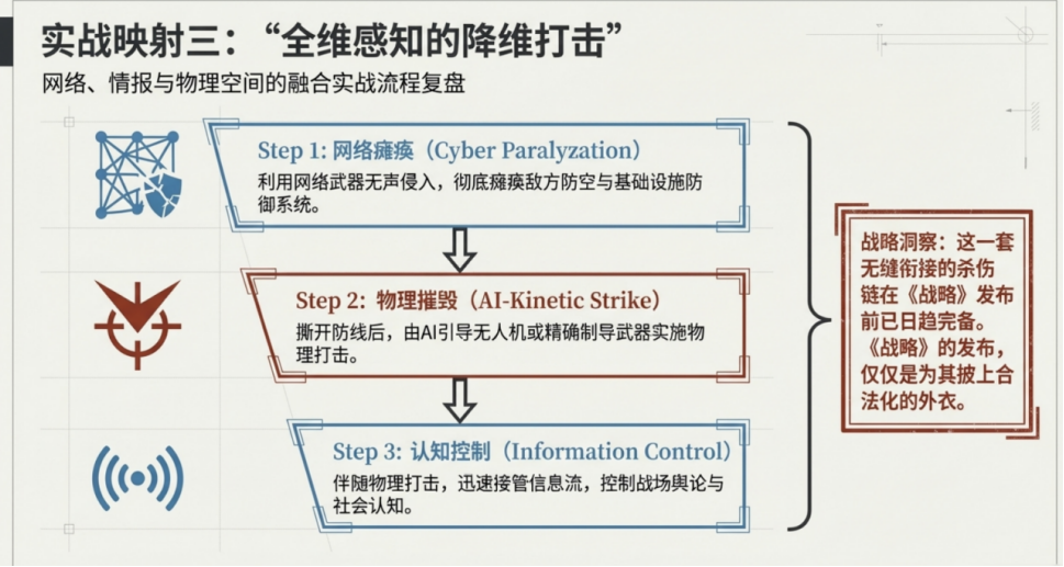 三是跨域融合的“物理映射”。《战略》强调的网络、情报与物理空间的融合,在委内瑞拉大停电与伊朗“斩首”行动中得到了完美互证。这不再是单一领域的较量,而是一场“全维感知的降维打击”。通过网络手段瘫痪防御系统,再由AI引导物理打击,最后通过信息流控制舆论,这一整套流程在《战略》发布前其实已经日趋成熟与完备,而文件的发布似乎是一种“师出有名”。这不仅是内部的制度确认,也是在国际语境下为“进攻性网络行动”寻求某种合法性或威慑效力。