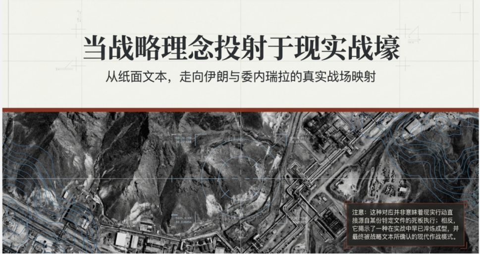 如果将上述《战略》释放的信号放在伊朗、委内瑞拉等作战行动背景下加以观察,可以发现若干值得注意的作战特征,二者之间存在某种值得注意的对应关系。《战略》中所强调的一些理念在作战行动实践中,也能够找到相似的运作逻辑。需要说明的,这种对应并不意味着现实行动直接源自战略文本,但通过对战略理念与行动特征进行对照观察,仍然可以看到一种逐渐清晰的作战模式。例如: