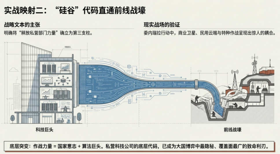二是“硅谷”走向“战壕”。《战略》第三支柱明确了“释放私营部门力量”。这解释了为何在针对委内瑞拉的行动中,商业卫星、民用云端与特种作战呈现出惊人的耦合。战争的主体似乎正从单纯的职业军人,扩张为“国家意志+算法巨头”。私营科技公司的代码,正成为大国博弈中最隐秘且致命的利刃。