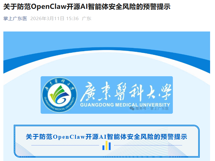 3月11日,广东医科大学网络与信息中心发布《关于防范OpenClaw开源AI智能体安全风险的预警提示》提醒高校师生称,部署OpenClaw要注意防护,避免电脑里的毕业论文、实验数据、科研成果,以及个人账号密码、校园信息等,面临被窃取、篡改的风险。