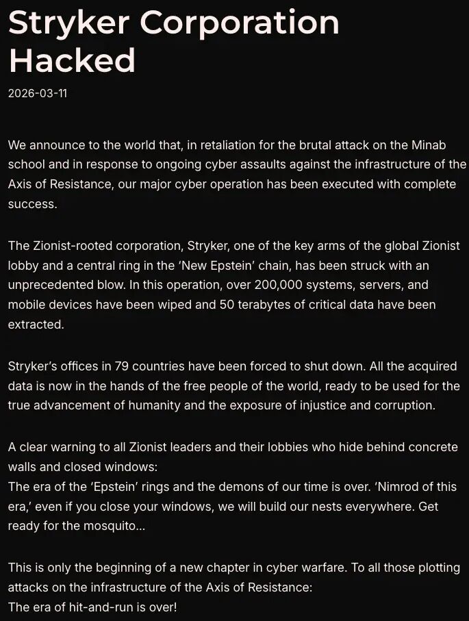 一个自称为Handala的组织据称在网上发布声明,宣称对攻击史赛克负责,并表示之所以将该公司作为目标,是因为近期美国对伊朗一所女子学校发动导弹打击,以及美国、以色列和伊朗之间持续的军事冲突。