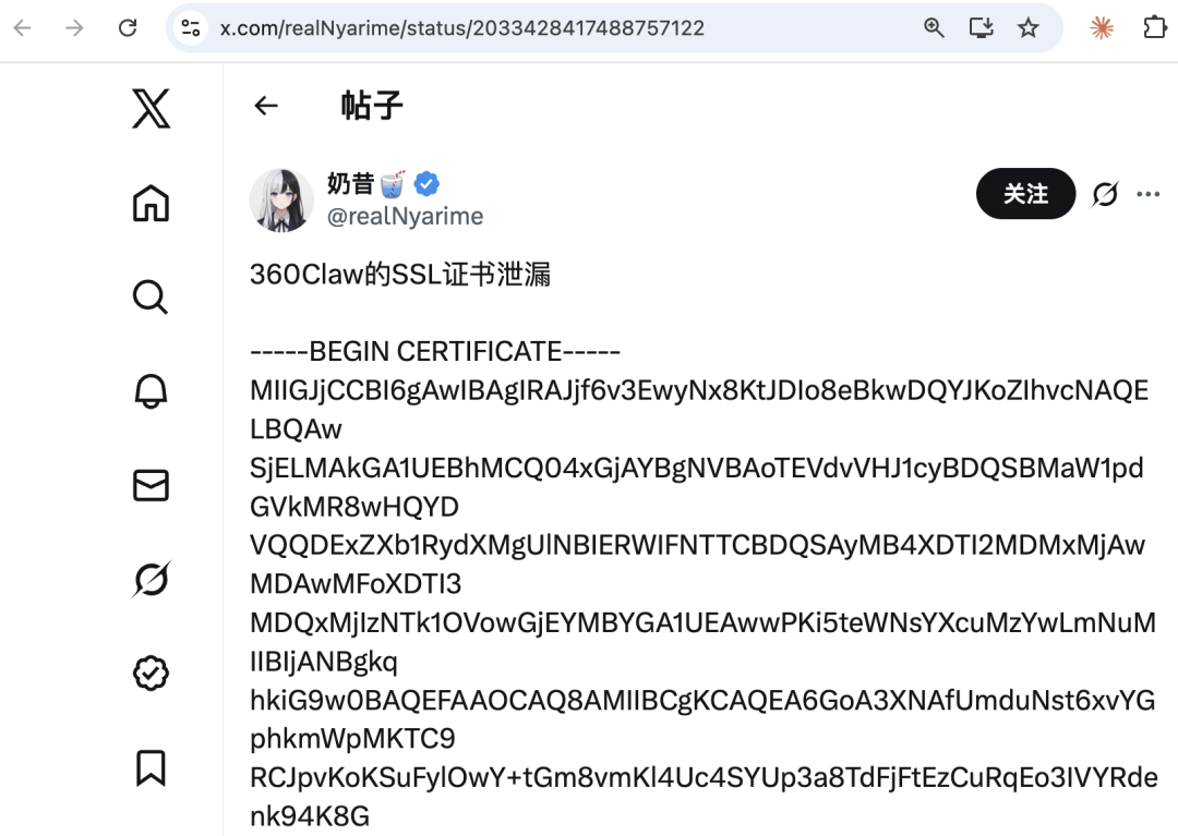 [5]X用户 @realNyarime 贴出的完整证书 PEM 编码:https://x.com/realNyarime/status/2033428417488757122