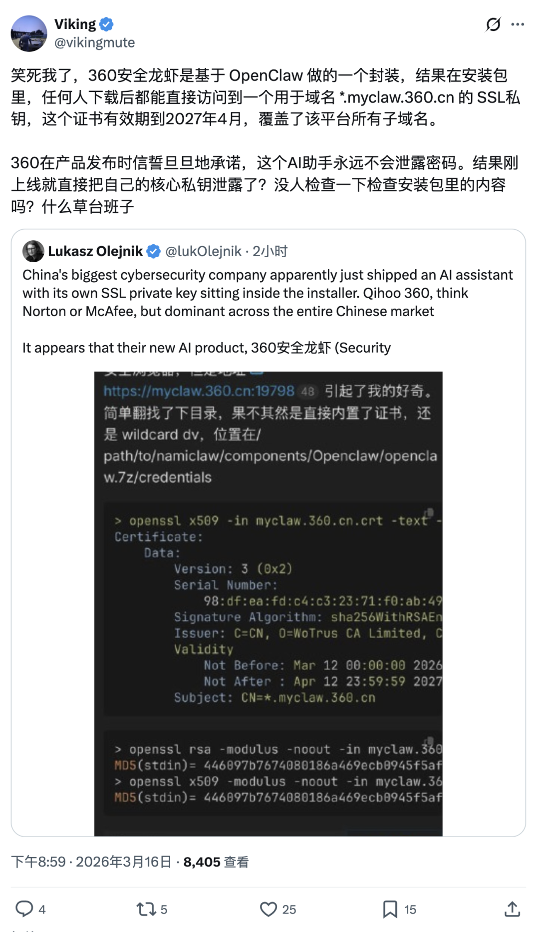 近日,安全社区发现:360 刚发布的 AI Agent 产品 "360安全龙虾"(基于 OpenClaw 的一键部署客户端),在其公开安装包中,包含了 *.myclaw.360.cn 泛域名证书的 SSL 私钥文件。