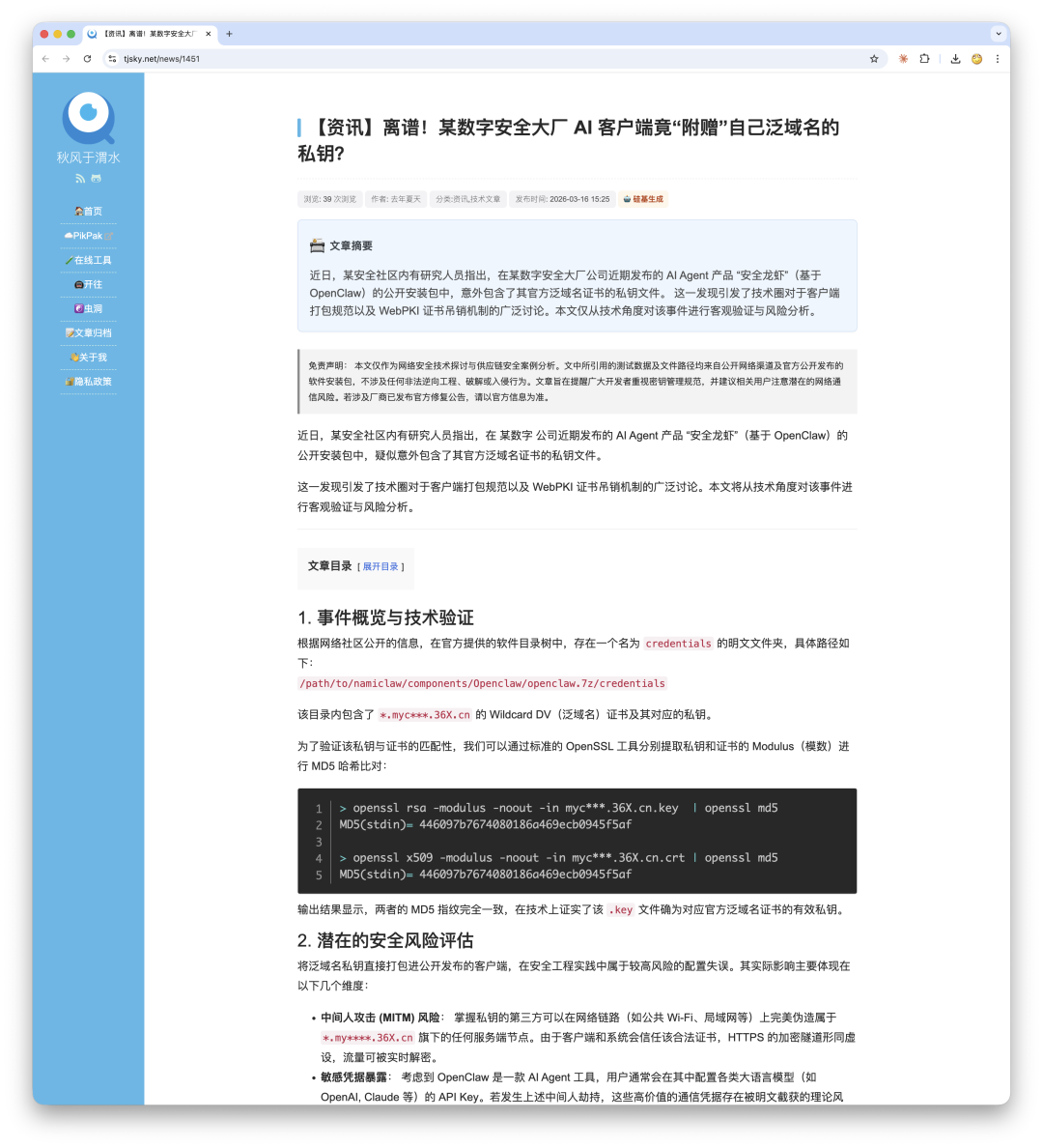 据安全博客"秋风于渭水"的独立验证,通过标准的 OpenSSL 工具分别提取私钥和证书中的 Modulus(模数),进行 MD5 哈希比对,两者的指纹完全一致,在技术上证实了该 .key 文件确为对应泛域名证书的有效私钥。