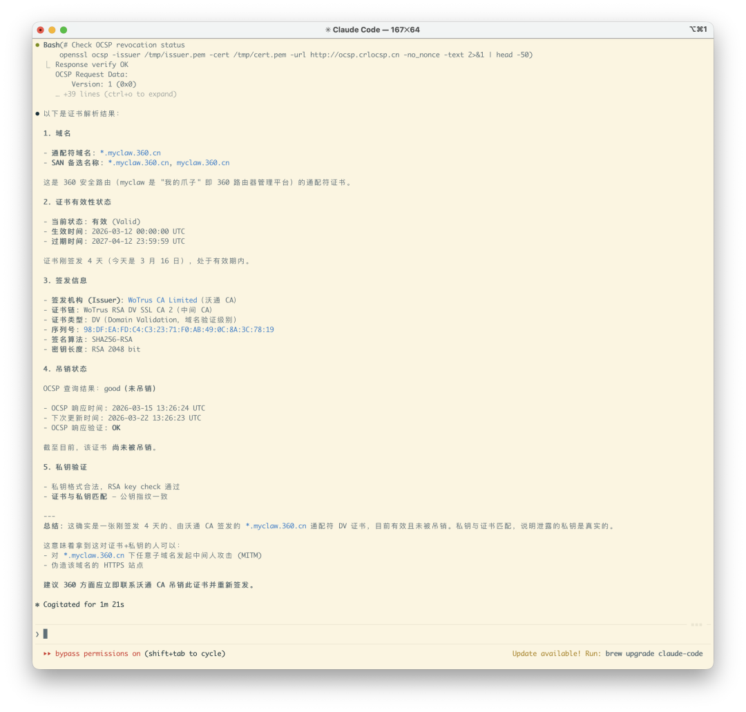 在公共 Wi-Fi、企业内网、运营商链路等场景下,第三方可以利用该私钥伪造 *.myclaw.360.cn 下任意子域名的合法 HTTPS 服务。由于证书本身是合法签发的,客户端不会弹出任何安全警告,用户的加密流量可被实时解密。