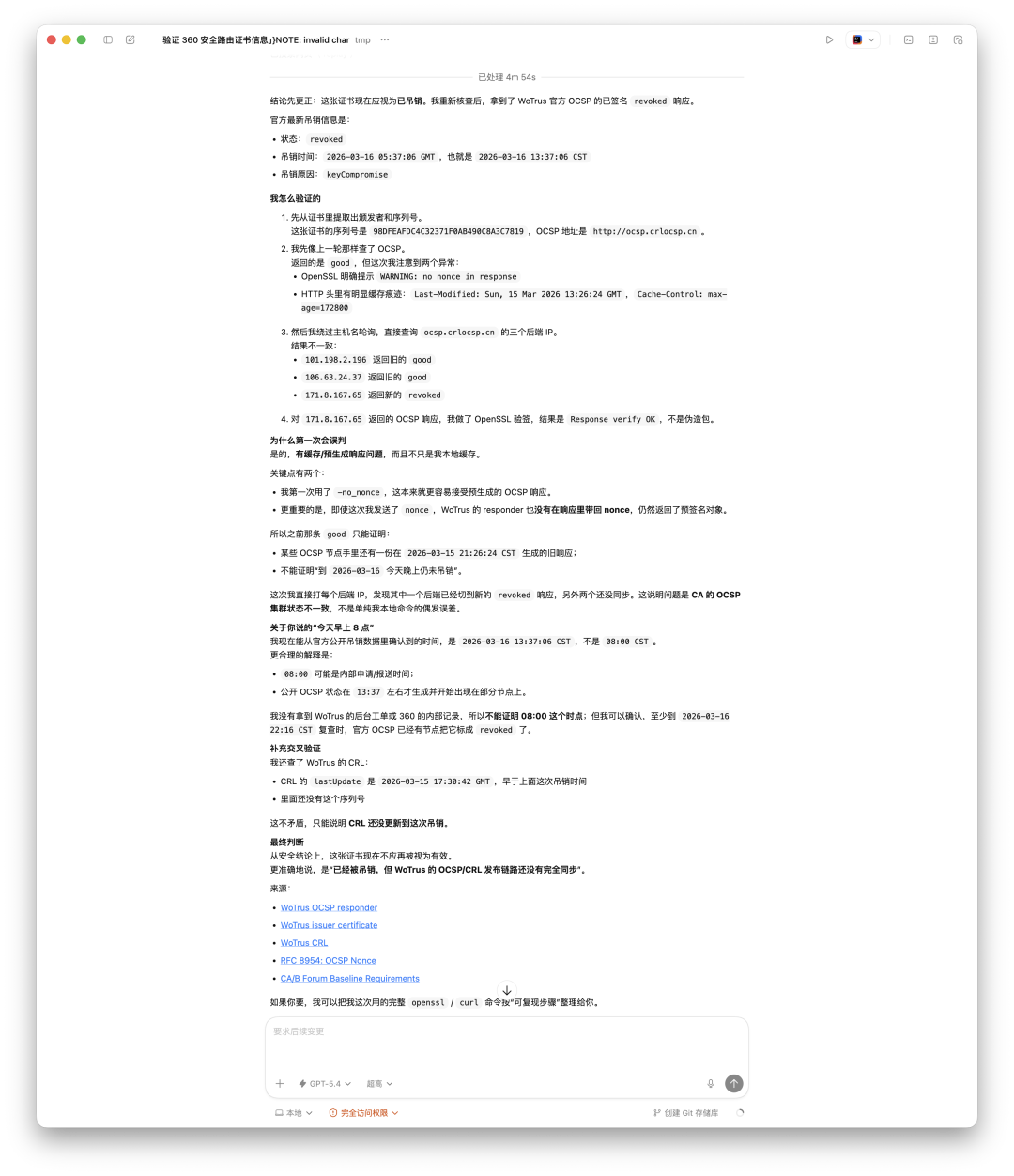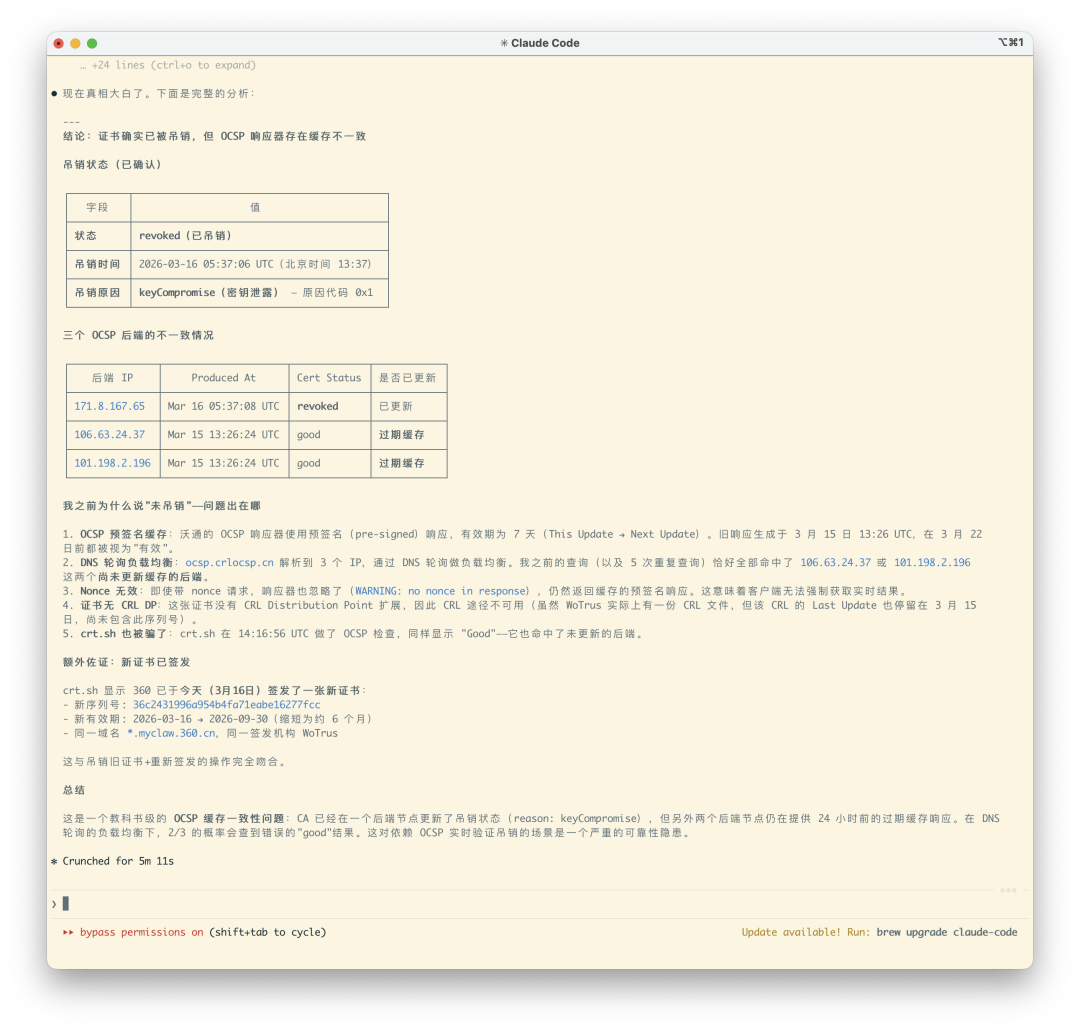 该证书确实已经吊销。但这个发现本身暴露出证书基础设施的一个严重可靠性隐患:即使你已经真的吊销了证书,在相当可观的一段时间里面,OCSP 依然可能在返回结果中认为它是有效的。