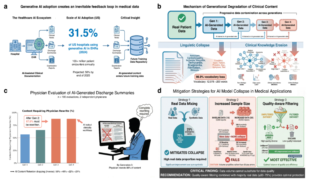 人工智能正在改变全球医疗文档系统,大型语言模型已经被广泛地应用到临床报告、出院小结、电子健康档案等方面,AI 辅助诊断已经得到广泛的应用。但是其中隐藏的风险是,原来依靠人工建立起来的医疗数据库正在被大量的 AI 生成内容所取代,而且不断保存在诊疗记录中,从而成为下一代 AI 训练的数据来源,形成了一个「生成-训练-再生成」的自循环结构。