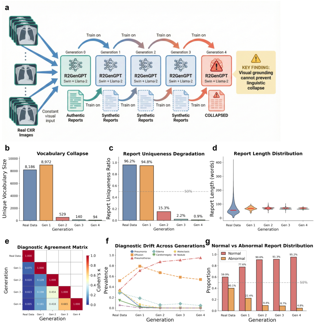人工智能在医学影像生成报告的时候,语言退化仍然会发生。研究使用了 Swin-Transformer、Llama-2 的视觉语言模型 R2GenGPT,用真实的胸部 X 线片做输入,只用合成报告来训练。图 3 结果说明即使有真实的图像,模型也会出现严重的退化,报告的唯一性从原来的 96.2% 下降到现在的 0.9%,词汇量从原来的 8186 个减少到现在的 94 个,减少了 98.9%。