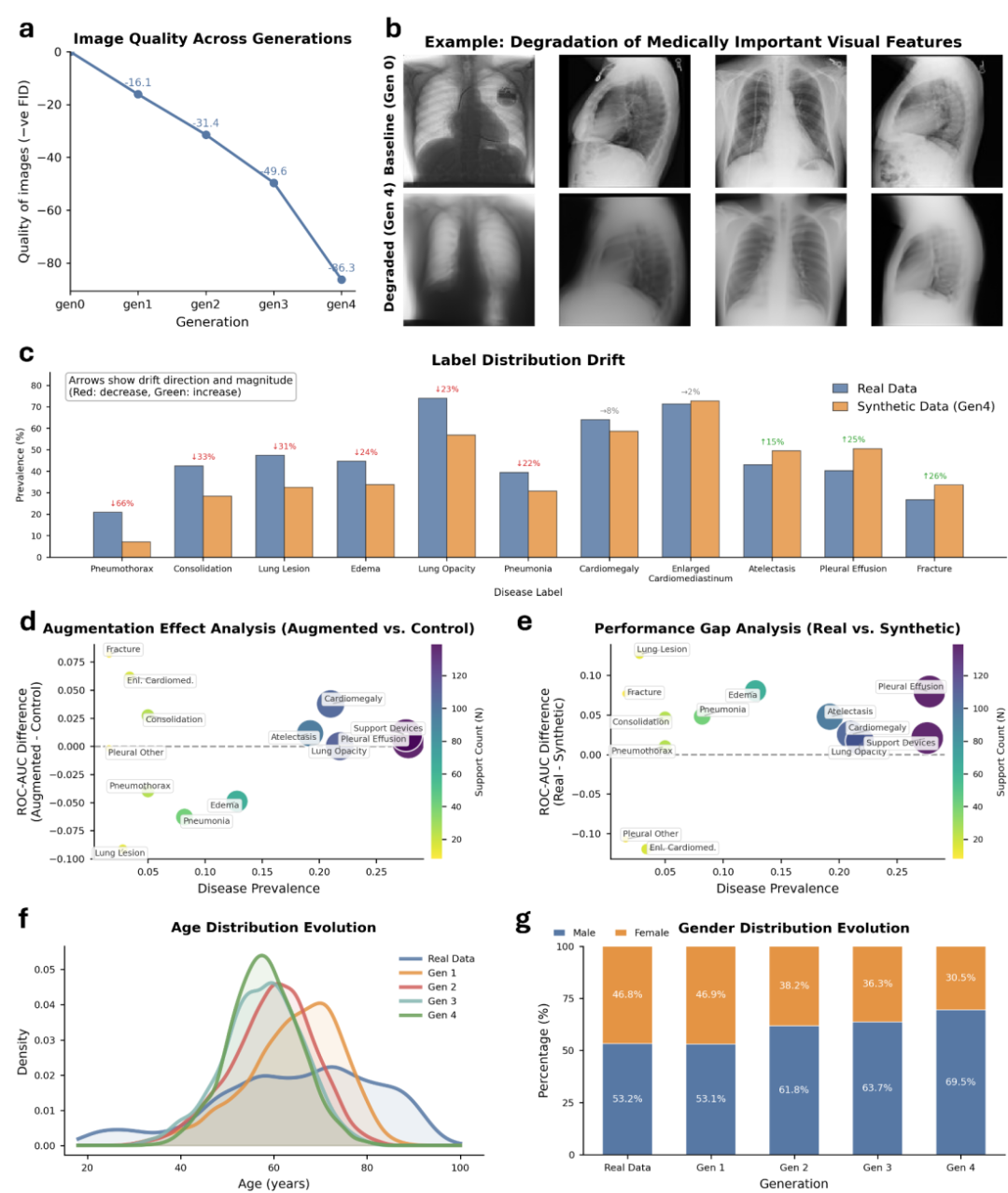 除此之外,人工智能生成的合成医学影像也越来越广泛地被用来进行研究、产品研发等,用以扩充训练数据集、实现隐私保护型的数据共享。但是当这些合成影像被用来训练后续的人工智能模型的时候,生成出来的影像很难体现真实患者人群的多样性,为了探究影像生成会不会出现和文本模型一样的退化模式,研究团队在多轮自我训练循环中,用胸部 X 光片来训练人工智能影像生成模型。从实验结果(图 4)可知,由于人工智能合成的数据污染而产生的视觉退化、病理表征扭曲以及人口统计学偏倚等都会被加重。