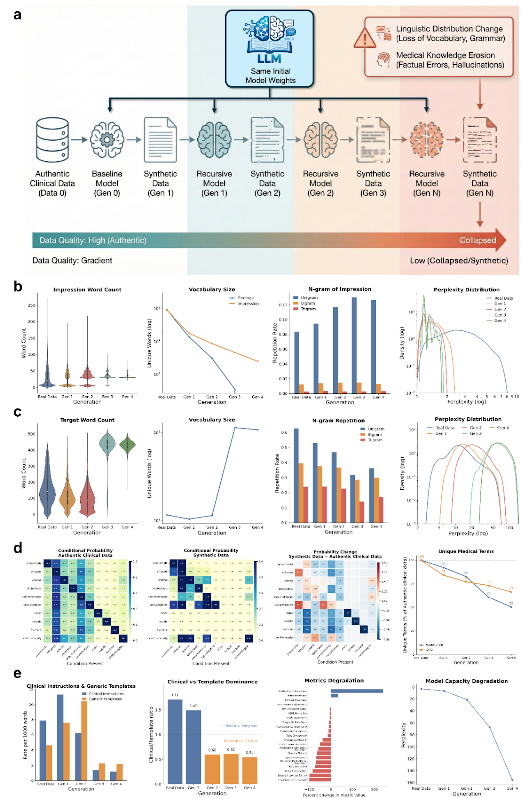 最近新加坡国立大学、哈佛大学、斯坦福大学等机构联合团队最新研究显示,当 AI 生成的临床文本被用作训练新一代 AI 模型时,一些罕见但是重要的病理信息会在数据迭代的过程中悄悄地消失,从而使得医疗 AI 整体诊断可靠性在群体上不断下降。