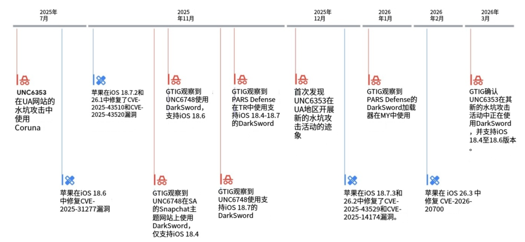 2026 年 3 月 | UNC6353 组织针对乌克兰的水坑攻击仍在持续,谷歌威胁情报小组与乌克兰计算机应急响应小组合作完成了攻击缓解;三方联合发布 DarkSword 完整研究报告 |