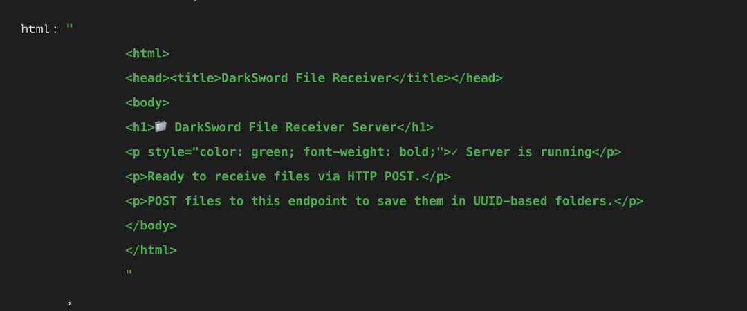 DarkSword 中硬编码了 C2 域名,泄露的数据会发送到 8881/8882 端口,这两个端口托管着一个名为“DarkSword 文件接收器”的端点。该端点使用 BaseHTTPServer 以及其提供的 HTML 内容表明,服务器端代码可能出于演示目的包含在 DarkSword 的销售中,或者是由攻击者自行创建的。一些迹象表明,DarkSword 基础设施的这一部分是在 LLM大模型的协助下创建的,例如标题中的文件夹表情符号和勾号。