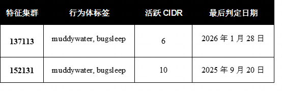 这两个集群都带有BugSleep标签以及MuddyWater 的标记,这与MuddyWater已知的使用BugSleep恶意软件以及其针对中东地区相关目标的行动重点相符。特征集群137113包含三个不同阶段的共11个判定,最早可追溯至2020年10月。特征集群152131包含三个阶段的共14个判定,最早可追溯至2022年3月。