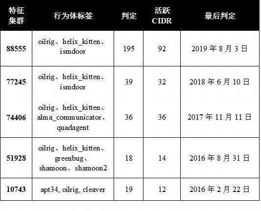 数据集中的特征集群51928是最早的OilRig网络集群,最早于2015年12月被判定,也是唯一一个同时带有Shamoon和Shamoon2标签以及OilRig/helix_kitten标识符的集群。这种共现表明,OilRig相关的网络基础设施与2016年和2017年针对沙特阿拉伯组织的破坏性擦除攻击活动密切相关,这与开源报告关于OilRig在此期间在更广泛的伊朗网络攻击生态系统中所扮演角色的描述相符。特征集群10743除了oilrig和cleaver标签外,还带有apt34标签,这反映了在2014年至2016年期间,在情报界采用更标准化的命名规则之前,这三个跟踪标识符之间存在重叠。