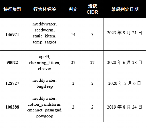 特征集群146971包含数据集中与MuddyWater关联的最广泛的别名,除了muddywater外,还包括seedworm、static_kitten和temp_zagros,这反映出同一攻击者组织的多个跟踪名称被整合到同一个集群中。其最新判定日期为2023年9月,使其处于上述活跃集群和下方2020年前完全休眠集群之间的过渡位置。该特征集群中的3个活跃无类别域间路由(CIDR)代表自该日期以来未更新的基础设施,可能不再对与伊朗有关联的威胁行为者具有实际意义。