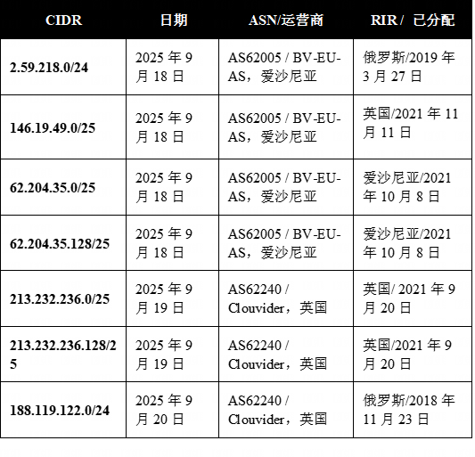 在2025年9月18日至20日的72小时内,共标记了7个无类别域间路由(CIDR)。其中5个位于AS62005 BV-EU-AS上,这是一个在爱沙尼亚注册的自治系统编号,于2022年2月分配。分配给这些前缀的国家代码涵盖俄罗斯、英国和爱沙尼亚,这种混合分配模式与防弹主体提供商的行为一致。62.204.35.0/24和213.232.236.0/24上的/25子网对模式与之前MuddyWater分配阶段观察到的子网拆分一致。剩余的两个无类别域间路由(CIDR)位于AS62240 Clouvider上,Clouvider是一家总部位于英国的通用托管服务提供商,有记录显示其曾被多个威胁组织滥用。