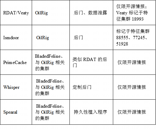 以下恶意软件家族与伊朗行为者有关,并且与本报告中记录的基础设施集群相关。