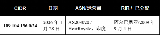 2026年1月28日,HostRoyale(AS203020)的一个/24域名被标记,大约在攻击发生前1个月。继2020年10月的首次爆发和2022年2月的集群之后,这是特征集群137113的第三阶段活动。HostRoyale是一家在印度注册的服务器提供商,运营着阿尔巴尼亚的域名空间,这种组合符合多层管辖权混淆的策略。该提供商在该特征集群的历史记录中多次出现,表明其可能一直倾向于使用该运营商,或者存在某种长期合作关系。