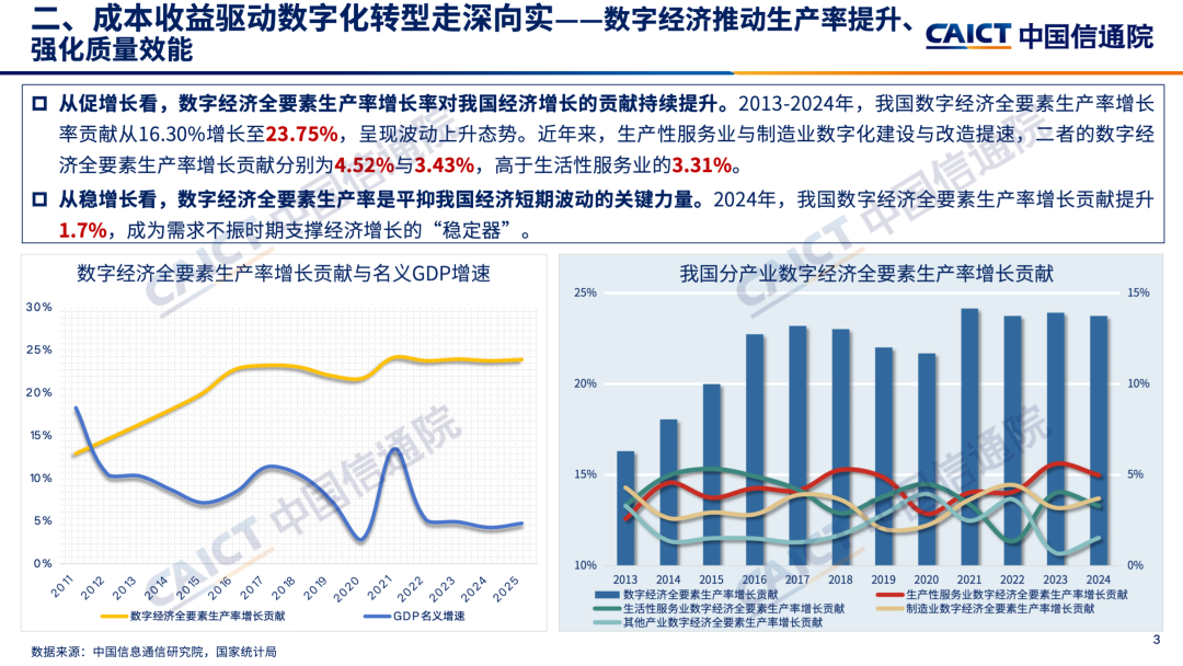 3. 降本增效成为驱动实数深度融合的关键动力。在宏观层面,数字经济全要素生产率有效支撑经济稳增长,2013-2024年,我国数字经济全要素生产率对经济增长的贡献率从16.30%增长至23.75%,支撑我国经济发展效率不断提升。在微观层面,数字化改造显著降低成本、拓展企业利润空间,数字化投入每提升1%,主营业务成本率下降9.17%,成本费用利润率提高6.71%,且测算显示,数字化发展对降低企业研发、生产、管理过程的成本最为有效。