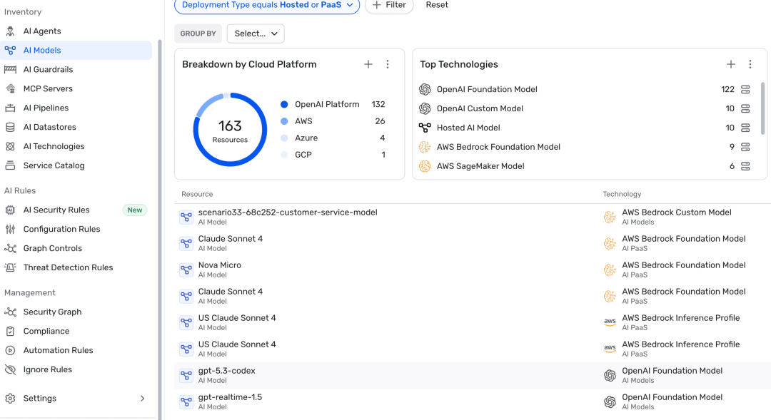 企业 AI 应用的落地形态高度分散,横跨云厂商托管服务、SaaS AI 平台、自定义自研应用三大场景,带来了大量的安全盲区。Wiz AI-APP 通过多维度检测手段,为企业构建全量、完整的 AI 资产清单,实现无死角可见性:
