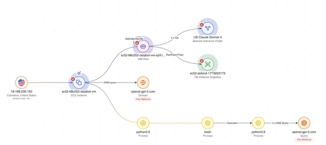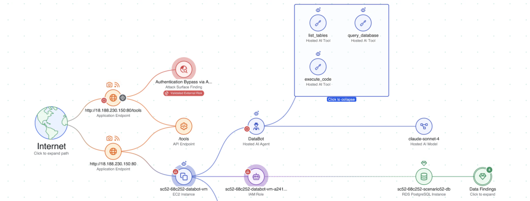 以前文提到的 AI 聊天机器人风险场景为例,Wiz 会关联全层级的风险信号: