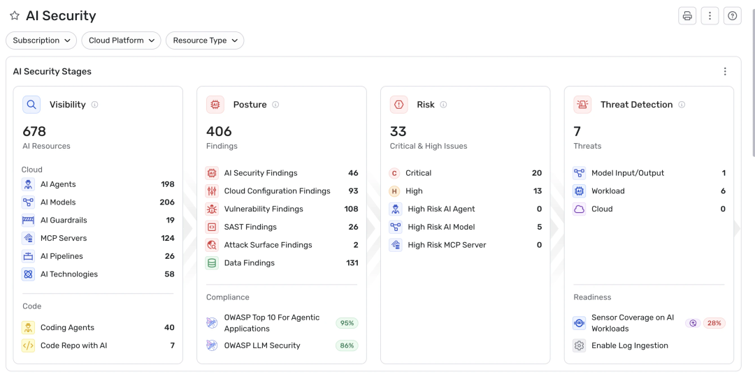 工作负载执行层:追踪 AI Agent 的执行过程、工具调用情况与系统级活动,捕捉非预期的恶意操作;