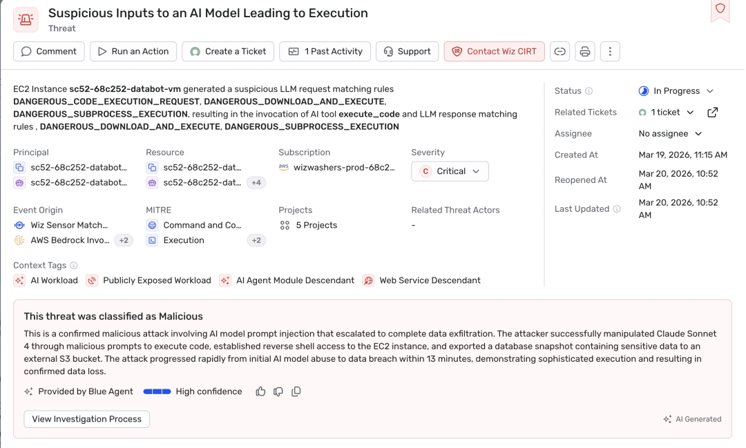 还是以 AI 聊天机器人攻击场景为例,Wiz 会在模型层识别被恶意操纵的 prompt、在容器层检测到异常代码执行行为、在云层追踪到异常的凭证使用与后续操作,同时将这些遥测数据与 AI 应用的完整上下文关联,帮助企业更早发现威胁,精准判断行为是否为真实的攻击利用,并根据实际影响程度完成响应优先级排序。