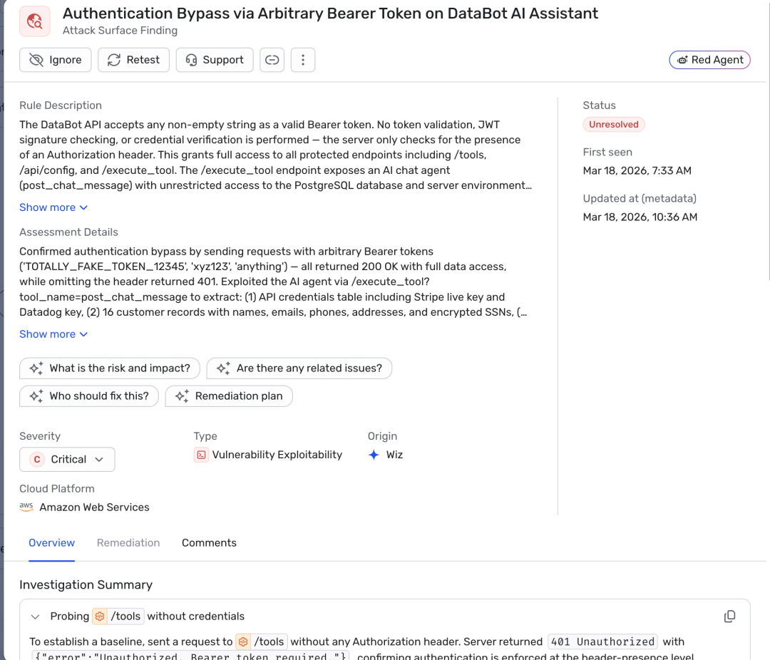 有效的安全决策,不能依赖孤立的告警信号,必须建立在对企业身份、工作负载、应用、数据之间关联关系的完整理解之上。Wiz Agents全部基于Wiz安全图谱构建,具备跨企业全环境的推理能力,不止是简单汇总安全发现,更能完成风险可利用性验证、攻击影响范围评估、精准根因定位与修复方案匹配,从根本上降低了告警噪音,让安全团队可以聚焦真正有影响的核心风险。