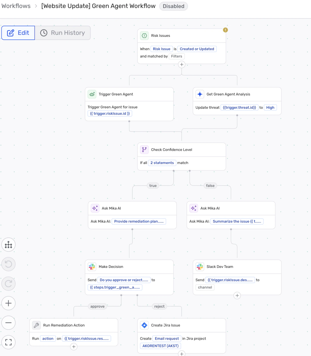 有了AI Agent的深度分析与精准洞察,如何把这些能力转化为企业可重复、可扩展、可管控的常态化安全动作,成为了新的核心挑战。Agentic Workflows正是为解决这一问题而生。 Agentic Workflows是Wiz平台内置的云与AI安全编排中枢,它整合了Wiz的全量环境上下文、三大AI Agent的分析能力,搭配灵活的拖拽式可视化界面,让安全团队可以完全自定义AI在企业环境内的运行规则——大到AI Agent的触发时机、执行范围,小到每一个动作的人工介入节点、审批流程,都可以按需配置。 基于Agentic Workflows,企业可以搭建贴合自身业务流程的自动化安全运营体系,典型场景包括: