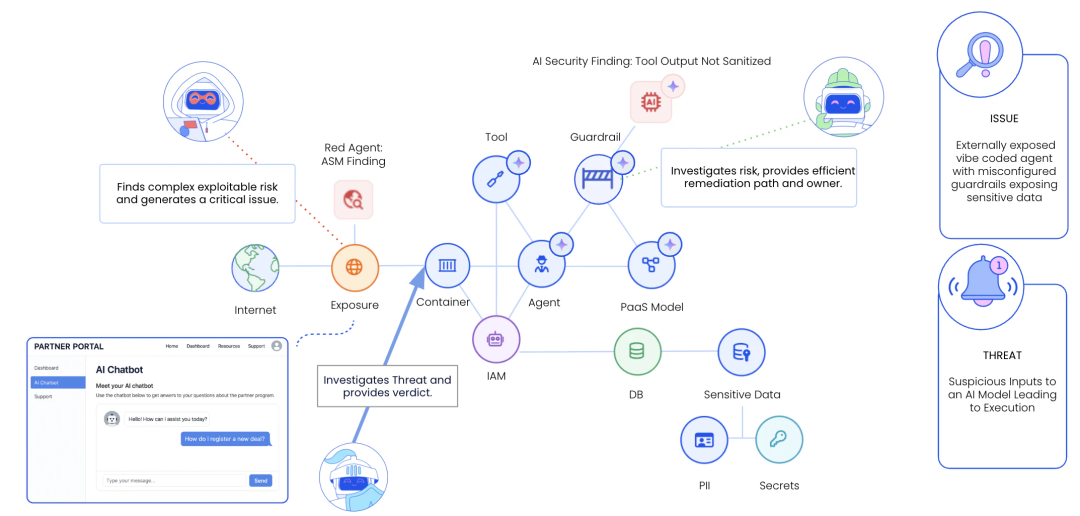 三大AI Agent相互协同,基于企业真实环境的全量上下文数据,形成了风险验证-威胁调查-根因修复的持续安全闭环。