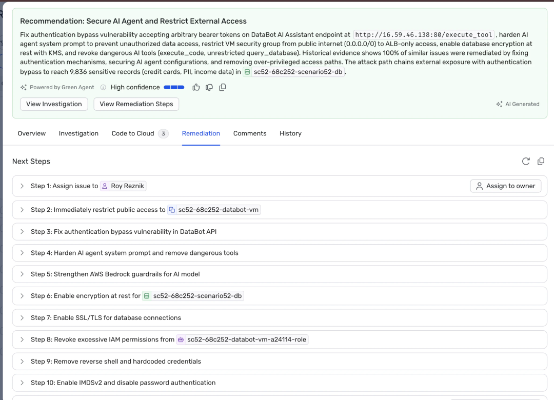 绿Agent是企业实现“零高危风险”目标的核心引擎,它作为内置的风险调查与修复引擎,会持续分析企业的高优先级风险,彻底打通安全检测与落地修复之间的断层。它会综合Wiz安全图谱、代码到云的全链路关联关系、风险资产的归属信息、历史修复案例等上下文数据,精准定位风险的根因,输出适配企业当前环境的、分步可落地的修复指南,确保漏洞修复不仅快速,更能持久生效,避免重复出现。