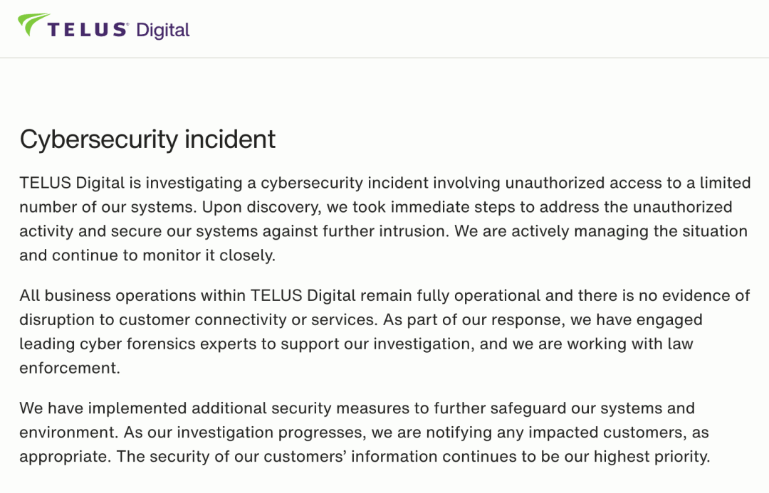 Telus告知BleepingComputer:“TELUS Digital正在调查一起涉及未经授权访问部分系统的网络安全事件。公司在发现后立即采取措施应对相关活动,并加固系统以防止进一步入侵。目前我们正积极处置该情况,并持续进行密切监控。”