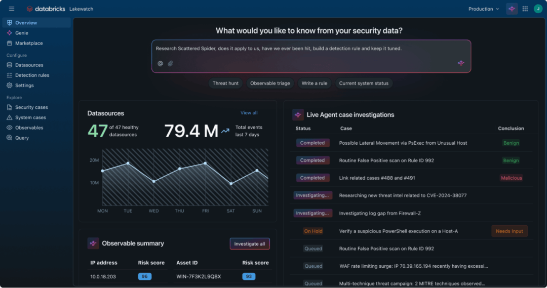 面对AI驱动的自动化攻击,Lakewatch的核心解法是“用Agent对抗Agent”。和传统SIEM外挂式的AI功能不同,Lakewatch将AI能力原生嵌入到数据层,让防御AI Agent可以直接访问全量数据上下文,发挥最大效能。