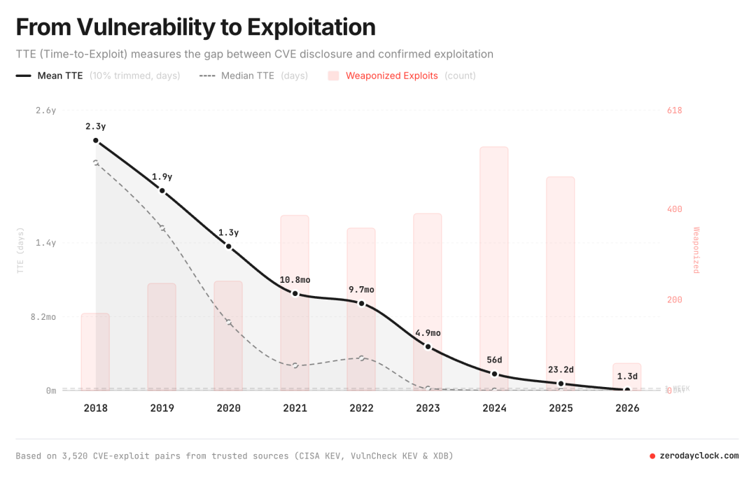 而与之相对的,是传统安全运营体系的结构性短板。传统SIEM产品依赖安全分析师手动丰富告警信息、人工编写检测规则、逐个验证威胁狩猎假设,整套流程往往需要数天甚至数周才能完成。这套模式在应对人工发起的攻击时尚且可用,但面对全天候、机器速度的AI攻击,架构本身就成了最大的防御瓶颈。来自ZeroDayClock的数据显示,漏洞利用的平均时间已从2025年的23.2天骤降至2026年的1.6天,攻防两端的响应速度差距被无限拉大。