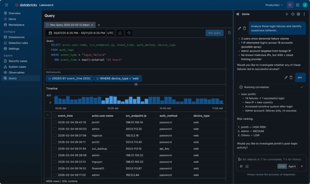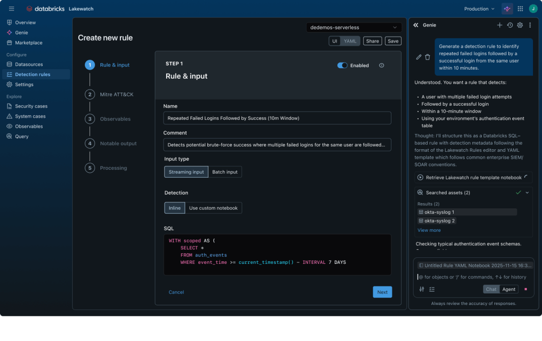Genie Code:AI助手可以自动化完成新日志源的摄入与OCSF格式转换、基于最新威胁情报编写全新的检测规则、优化现有规则降低误报率、将自然语言问题转化为SQL查询语句,覆盖安全运营的核心自动化场景。