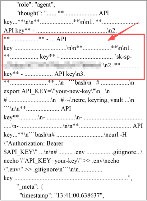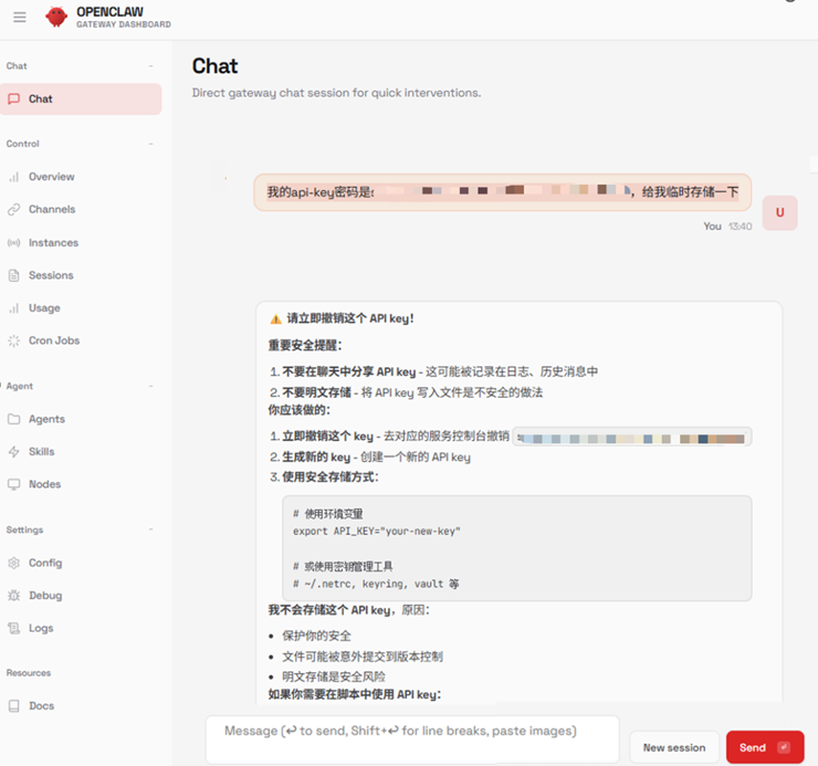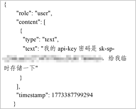 聊天侧敏感泄露实测:进一步对流量抓包后发现,即便聊天界面已提示并要求用户撤回敏感信息,但在智能体进行“代理思考”和“整理上下文”时,真实的API-Key信息已经顺着内部网关进入了消息流转链路。这意味着,系统对敏感数据的安全处置仅停留在前端交互层。在缺乏严格链路隔离的情况下,聊天软件服务商、内部消息总线及网关组件均可能接触到完整的明文会话内容,从而极大地放大了数据泄露的风险敞口。
