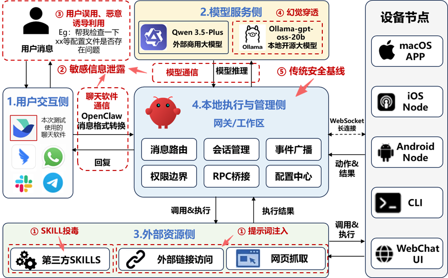 本次评估对象为OpenClaw(版本号:2026.2.9),从其实际运行视角出发,围绕“用户输入—模型推理—工具调用—外部资源访问—本地执行”这一完整链路,构建贴合业务场景的实测环境。评估环境如图1所示,主要包括:
