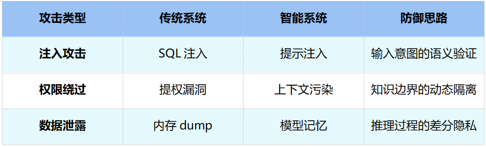 安全领域的变化尤为显著。传统系统面对的是SQL注入、提权漏洞、内存dump等攻击手段,防御思路已经相对成熟。但智能系统引入了一组全新的攻击面:提示注入取代了SQL注入,攻击者通过精心构造的自然语言输入来劫持模型行为;上下文污染[14]取代了传统提权,通过向模型的上下文中注入误导性信息来绕过知识边界;模型记忆带来的数据泄露风险也不同于传统的内存泄露:攻击者可能通过成员推断攻击从模型中还原训练数据。这些新攻击的共同特点是发生在语义层面而非代码层面,防御手段也需要从语法检查转向语义验证。