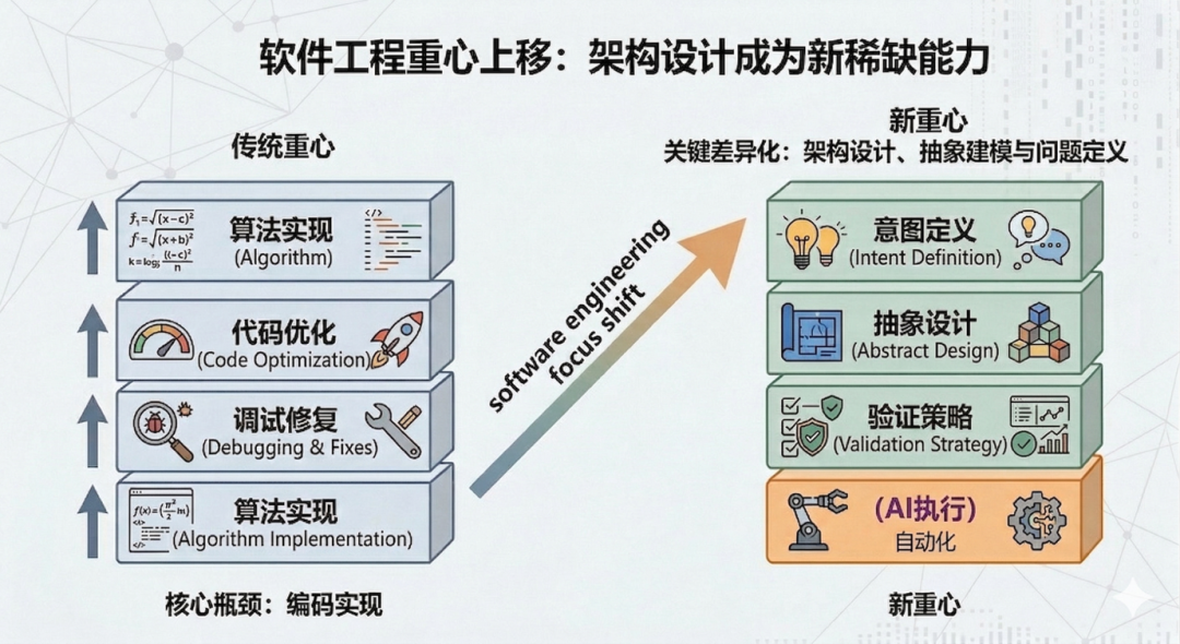 CCC的案例揭示了一个正在发生的转变:编码实现作为软件工程核心瓶颈的位置在减弱。当AI能够在明确约束下高效生成代码时,真正稀缺的能力逐步上移到了架构设计、抽象建模和问题定义。过去软件工程的重心沿着“算法实现→代码优化→调试修复”展开,而现在正在变成“意图定义→抽象设计→验证策略”,编码执行本身越来越多地可以交给AI来完成。