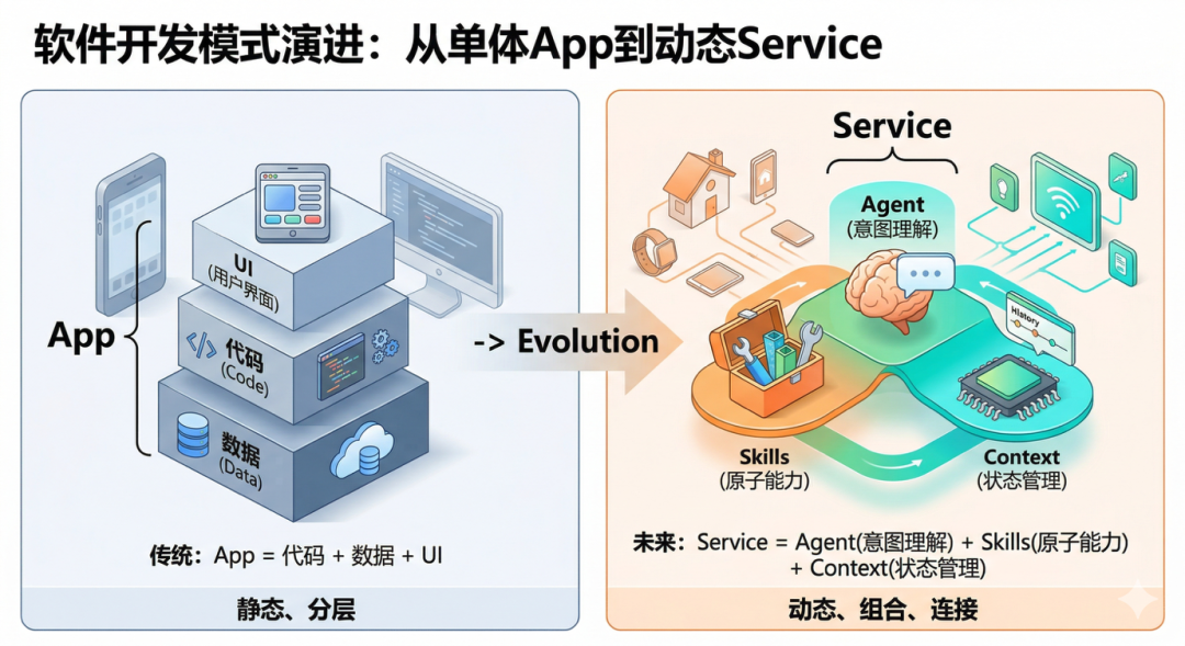 传统应用通常由代码、数据和UI打包成相对固定的整体,功能边界清晰,调用关系静态。而在智能时代,应用将逐步从“固定功能集合”演化为Agent、Skills 与 Context的动态组合体。