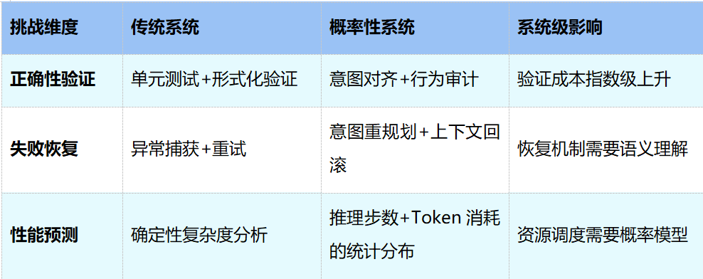 首先是正确性验证。传统系统靠单元测试和形式化验证就能确认“输出是否正确”,因为预期结果是确定的。但当输出具有概率性,“正确”本身就需要重新定义——验证的对象从“结果是否精确匹配”变成了“行为是否与意图对齐”,验证成本随之大幅上升。