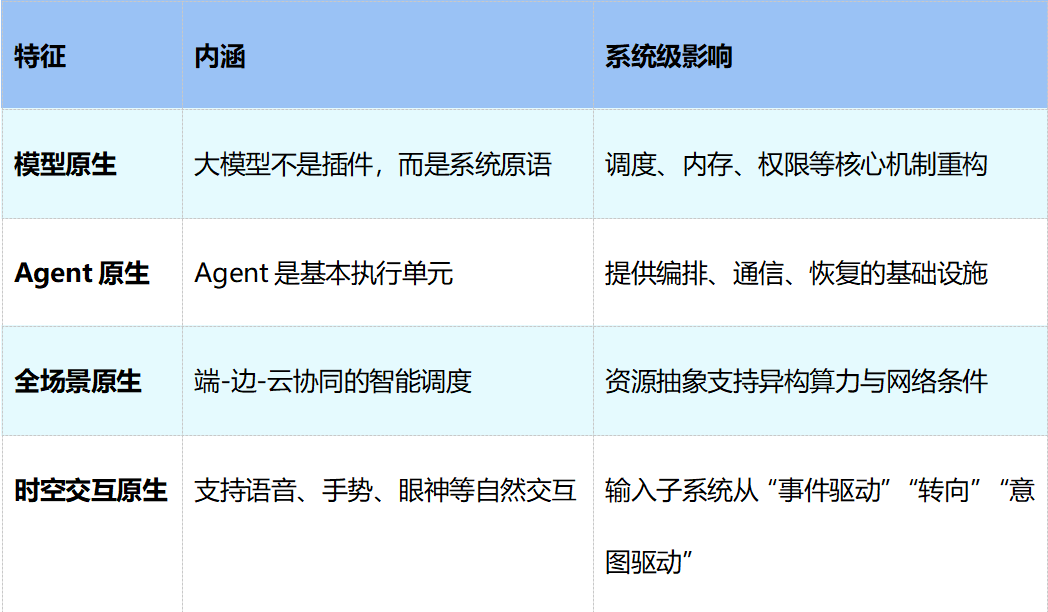 1、模型原生[17]:在传统系统中,模型只是外挂能力,属于应用层按需调用的组件;而在智能世界OS中,大模型将成为系统级基础原语。无论是任务规划、上下文理解、资源调度,还是权限判定、风险评估与执行优化,都需要围绕模型能力进行重构。