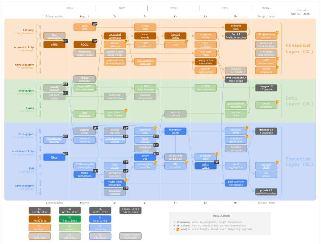 当前的初步预估显示,以太坊Layer 1的重大抗量子升级有望在2029年准备就绪。这一转型被深度整合到了以太坊更宏大的“strawmap”路线图中,涵盖了Consensus Layer、Data Layer和Execution Layer的全方位升级: