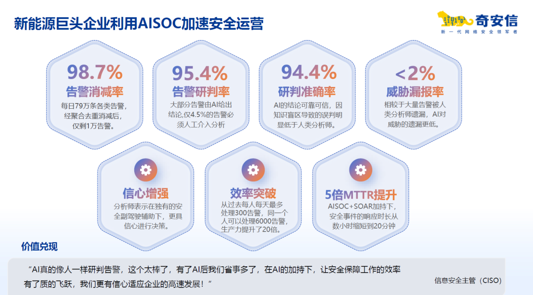 奇安信正在将这一理念深度融入AISOC的产品演进与客户实践之中。从金融领域的智能研判、新能源领域的告警消减,到跨国车企的全球协同运营、国家部委的全流程闭环——这些实战案例背后,正是AI赋能安全从“能做事”到“做对事”、从“单点辅助”到“体系协同”的能力跃迁。