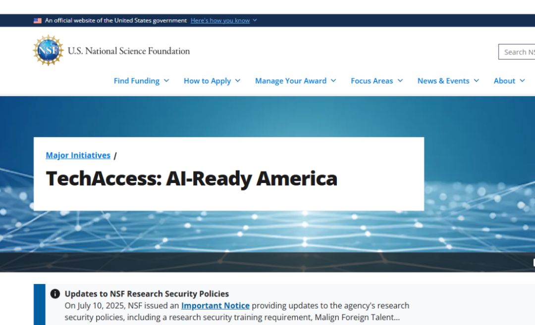 近日,美国国家科学基金会(NSF)联合多个联邦机构一同发起“技术接入:美国人工智能就绪”(TechAccess: AI-Ready America)计划,启动全国性AI能力建设布局。